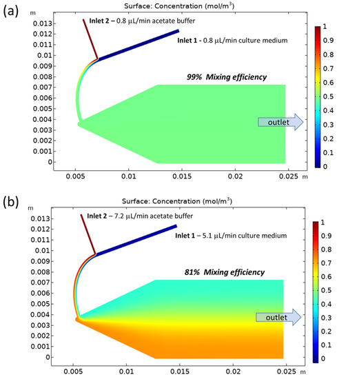Figure 6 depicts the steady-state concentration distribution achieved by FEA for the best and worse investigated combinations of flow rates (case #1 and case #4 indicated in Table 1), with a ME of 99% and 81%, respectively. In the simulations, the diluted species (acetate buffer) was assumed entering in Inlet 2 at a concentration of 1 mol/m3, while the concentration was 0 mol/m3 in Inlet 1. In the concentration profile depicted in Figure 6, the red colour represents the unmixed species (acetate buffer) in the culture medium (blue colour), while the mixed species is represented by the green colour (with a concentration equal to half of that entering, 0.5 mol/m3). The steady-state concentration of the diluted species is clearly uniform in Figure 6a (case #1 with ME = 99%), while an evident gradient of concentration is visible in Figure 6b, due to a lower ME (81% for case #4).