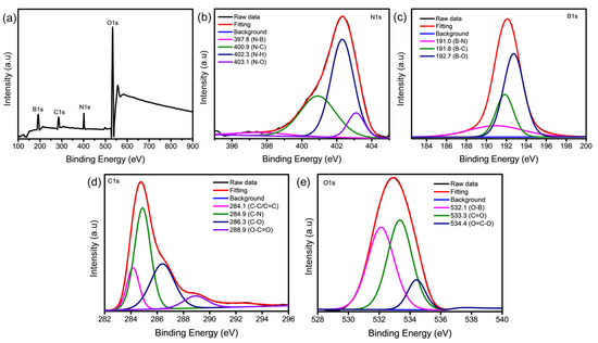 High-resolution XPS analysis of NB-CDs. (a) Survey spectrum, (b) N1s, (c) B1s, (d) C1s, and (e) O1s.