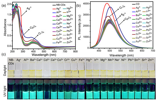 To study the UV–Visible absorption and photoluminescent (PL) response of the NB-CDs (20 µg/mL) to various cations, Al3+, Ba2+, Ag+, Cd2+, Ca2+, Co2+, Cu2+, Fe3+, Cr3+, Ce3+, Zn2+, Mg2+, Mn2+, Ni2+, Na+, Pb2+, Sr2+, Sn2+, and Ir3+ (10 μM) were added to a PBS buffer solution of NB-CDs (pH 7.4) as shown in Figure 6. Figure 6a shows the absorption spectra of the NB-CD sensor after adding Ag+, Cd2+, and Cr3+ ions, which produce a significant blue shift with absorbance changes. The maximum emission intensity of the free NB-CDs was 498 nm when excited at 396 nm, as shown in Figure 6b. Marginal shifts at 481, 488, and 502 nm signaled the turn-on of PL emission from the NB-CDs sensor upon the addition of Ag+, Cd2+, and Cr3+ ions (Figure 6b) [43,44,45]. Doped systems are enhanced by additional electrons being incorporated into the CDs, which result in enhanced electron transfer due to the hole-like structures formed in CDs by the doping of boron. By incorporating boron inside the CDs, the faster electron transfer process towards surface-attached NB-CDs should be perturbed. In contrast, after boron doping for CDs (NB-CDs), the reaction mixture led to further increasing PL intensity along with the Ag+, Cd2+, and Cr3+ ions. Compared to other cations commonly found in physiological and environmental samples, NB-CDs more efficiently detect Ag+, Cd2+, and Cr3+ ions. This observation suggests that the NB-CDs have good selectivity for detecting Ag+, Cd2+, and Cr3+ ions. The addition of Ag+, Cd2+, and Cr3+ ions immediately changed the color of the NB-CDs from yellow to colorless, and upon adding Cr3+ ions, the color changed from yellow to strongly yellow (Figure 6c). NB-CDs were exceptionally selective over other metal ions, as indicated by the color changes for each ion. Another characteristic of this probe is that it does not change color in the presence of other metal ions. Similarly, Ag+, Cd2+, and Cr3+ ions showed excellent PL behavior under a UV lamp, changing from faint green to bluish-green and strong green PL (Figure 6c). The PL behavior of the other metal ions was not observed. The NB-CDs show color changes when cations are added because their surfaces coordinate with Ag+, Cd2+, and Cr3+ ions. In the PL response test, all Ag+, Cd2+, and Cr3+ ions displayed efficient “Off-On” fluorescence behaviors. The functional groups present on the surface of NB-CDs are responsible for binding with Ag+, Cd2+, and Cr3+ ions. The presence of nitrogen (N) and oxygen (O) moieties on NB-CDs surfaces probably forms active binding sites towards Ag+, Cd2+, and Cr3+ ions, thus making it an efficient PL enhancement sensor [46,47].