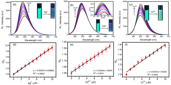 Job plot suggesting stoichiometry between chemosensor NB-CDs (20 μg/mL) and (a) Ag+, (b) Cd2+, and (c) Cr3+ ions (10 μM) = 1:1. The limit of detection calculations based on the PL intensity of NB-CDs with (d) Ag+, (e) Cd2+, and (f) Cr3+ ions (0–10 μM).