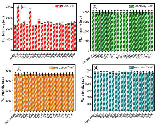 Histogram of the PL selectivity and interferences of (a) NB-CDs, (b) NB-CDs/Ag+, (c) NB-CDs/Cd2+, and (d) NB-CDs/Cr3+ systems in the presence of other metal ions.