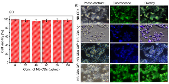 HCT-116 cells were tested for cytotoxicity and cellular imaging using the MTT assay to further demonstrate the applicability of NB-CDs in biological samples. HCT-116 cells were incubated for 24 h with the chemosensor NB-CDs at various concentrations (0, 20, 40, 60, 80, and 100 μg/mL) as shown in Figure 10a. Under our experimental conditions, more than 97% of the HCT-116 cells were viable, indicating that NB-CDs were not cytotoxic [52]. Thus, the NB-CDs can detect and image intracellular activities. Incubating HCT-116 cells at 37 °C for 0.5 h with NB-CDs (20 μg/mL) followed by 0.5 h with chloride salts of Ag+, Cd2+, and Cr3+ ions (10 μM) was conducted. The cells were then washed three times with PBS. Phase contrast, fluorescence, and overlay images were captured before and after the addition of Ag+, Cd2+, and Cr3+, as shown in Figure 10b. Faint green fluorescence was observed when HCT-116 cells were incubated with NB-CDs. After incubation with Ag+, Cd2+, and Cr3+, living cells showed blue and strong green fluorescence [53]. NB-CDs exhibited excellent cell membrane permeability in an overlay of fluorescence and phase-contrast images, indicating effective fluorescence signals [54]. Based on these findings, the NB-CDs can be used to detect Ag+, Cd2+, and Cr3+ in living cells.