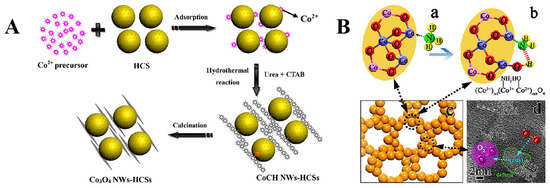 (A) Schematic illustration of the synthesis process of Co3O4 NWs-HCSs composite materials [15] Copyright 2019 Elsevier; (B) the mechanism of gas sensors based on 3D hierarchical porous Co3O4 materials [3]. Copyright 2016 Elsevier.