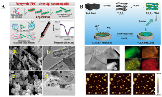 (A) Schematic of synthesis process, application, and morphology of rod-like polypyrrole-Ag nanocomposite for determination of dopamine [17]; Copyright 2022 Elsevier. (B) illustration of synthesis process and morphological characterization of Ti3C2Tx [18]. Copyright 2021 Elsevier.