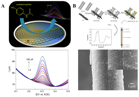 (A) Scheme of phosphorus-doped graphene for acetaminophen detection in pharmaceutical tablet [19]; Copyright 2018 Elsevier. (B) schematic illustration of synthesis process and morphological characterization of RGO-MWCNTs/Au and application for the determination of 2,3-DHBA, 2,5-DHBA, and 2,6-DHBA [20]. Copyright 2019 Elsevier.