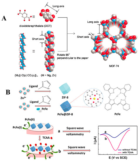 (A) Crystal structure of MOF-74 [21]; Copyright 2012 American Association for the Advancement of Science. (B) schematics of ZIF-8 and PcFe@ZIF-8 synthesis process, and the electrochemical sensing mechanism for trichloroacetic acid determination [25]. Copyright 2019 American Chemical Society.