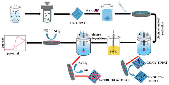 The preparation process of Au nanoparticles/RGO/Cu-MOFs composite material and the application for the detection of sodium nitrite [49]. Copyright 2019 Elsevier.