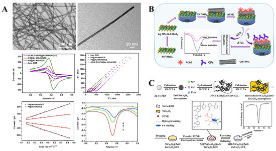 (A) TEM image of Pd@Au NWs network and the electrochemical behaviors of the nanosensor [54]; Copyright 2019 Elsevier. (B) schematic illustration for determination of monocrotophos and chlorpyrifos [55]; Copyright 2018 Elsevier. (C) the preparation process of MIP/NiCo2O4@ZnO/ZnCo2O4/GCE and electrochemical detection of pentachloronitrobenzene [56]. Copyright 2021 Elsevier.