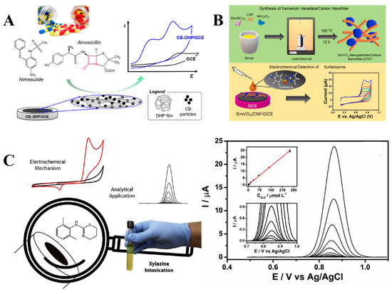 Deroco et al. [61] constructed an electrochemical sensor based on a carbon black nanoparticle-modified electrode and used it to detect Amoxicillin and Nimesulide simultaneously, which exhibited characteristics of being simple and having a low cost (Figure 7A). The film showed an excellent electrocatalytic activity to the electron transfer processes, and the proposed sensor presented better electrocatalytic activity to the electrooxidation of both Amoxicillin and Nimesulide, where the detection limits were 0.12 μmol/L and 0.016 μmol/L. George et al. [62] synthesized a samarium vanadate/carbon nanofiber composite and built the electrochemical sensor based the composite material for sulfadiazine analysis (Figure 7B), where the synergistic effect of the combination of samarium vanadate and carbon nanofiber accelerated charge transfer and generated more surface-active sites, which was conducive to the effective detection of antibiotics. De Araujo et al. [63] applied an electrochemical method to investigate the electrochemical behavior of xylazine and achieved an accurate quantitative method of xylazine by using the differential pulse voltammetry (Figure 7C). This work demonstrated the potential of electrochemistry for the clinical analysis of xylazine. In addition, de Araujo et al. [64] also fabricated a device which could scribe graphene on a polymeric polyetherimide substrate by using a laser, of which the device was used to detect xylazine sensitively based on electrochemical principles. As a veterinary drug, xylazine was associated with drug-facilitated crimes. The scratch on the sensor presented a highly porous characteristic, which contributed to the enhancement of the electroactive area. The sensor showed high sensitivity, selectivity, and accuracy and was successfully applied to analyze xylazine in practical samples, including beverage and urine samples. The work indicated that the electrochemical portable device could be a portable and low-cost alternative sensor for on-site quick testing.