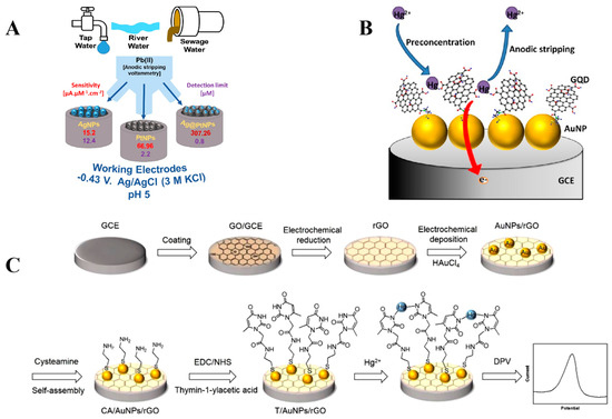 Among many pollutants, heavy metal ions are an important category [65], such as Hg2+, Pb2+, Cu2+, Zn2+, and so on [66,67,68]. Numerous studies have shown that their presence posed a major threat to human health [69], affecting the food chain and the stability of ecosystems [70,71]. At present, there are many published reports about the detection of trace heavy metal ions using methods such as inductively plasma-coupled mass spectrometry [72], atomic fluorescence spectrometry [73], HPLC [74], etc. Although these technologies have the advantages of high sensitivity and high selectivity, there are still some shortcomings when they are used as heavy metal detection methods. For example, the detection cost is too high, the operation procedure is complex, the detection time is too long, and the detection is difficult in the actual environment and real-time analysis. Electrochemical methods were used by many researchers to analyze the concentration of heavy metal ions in water. For instance, Smruti et al. [75] prepared silver and platinum composite particles (Ag@Pt NPs) from biological extracts via microwave radiation technology, constructed a biosensor, and applied them to the detection of Pb2+ in environmental water samples collected from rivers, domestic water supply, and sewage treatment plants (Figure 8A). Yun’s team [76] prepared an electrochemical sensor based on sodium carboxymethylcellulose/Silver nanoparticles (CMS/Ag NPs), which was successfully applied to the detection of Hg2+ and S2− in lake and tap water samples. Ting et al. [77] synthesized a novel coupling of graphene quantum dots and gold nanoparticles (Au NPs), and electrochemical methods were established based on the material for detecting heavy metal ions (Hg(II) and Cu(II)), which showed low detection limits and high sensitivity (Figure 8B). Wang’s group [78] assembled and synthesized the T-base functional Au NPs/rGO electrode, and the constructed electrochemical biosensor was used to determine mercury ions in water (Figure 8C). The sensor has excellent selectivity for Zn(II), Cd(II), Pb(II), Cu(II), Ni(II), Co(II) and other heavy metals. It has been applied to the determination of Hg(II) in actual environmental samples successfully.
