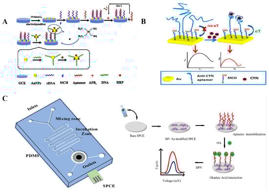Wang et al. [81] established an electrochemical aptasensor based on DNA-AuNPs-HRP nanoprobes, and the aptasensor was used to detect the content of aflatoxin B1 (AFB1) in peanut and corn samples (Figure 9A), with a detection limit of 0.33 ng/L. At first, the authors immobilized the complementary strand (cDNA) of the AFB1 aptamer (Apt) on the surface of the electrode, which was modified with gold nanoparticles. The specific recognition between AFB1 and Apt was utilized with the catalytic action of horseradish peroxidase. At last, they found concentrations of AFB1, and the electrochemical signals were linearly correlated, and the aptasensor was applied for the determination of AFB1 in peanuts and corn samples. Tang et al. [82] established an electrochemical aptamer-based method for the determination of the OTA by using different affinities of MoS2 for ssDNA and dsDNA. In addition, MoS2 possessed peroxidase-like activity, which plays an important effect in amplifying the electrochemical signal of the REDOX system. At last, the aptasensor possessed a linearity range of 1.0 pmol/L–2.5 nmol/L and the detection limit of 0.57 pmol/L. Wang et al. [83] also used aptamers as specific receptors to build a label-free aptasensor for the detection of CYN (Figure 9B). The aptasensor showed high specificity toward CYN, indicating that electrochemical-based aptasensors could be used as an alternative method for monitoring the content of toxins in food. Singh and colleagues [84] combined electrochemical sensing with microfluidic chip, and then designed and developed an electrochemical microfluidic biochip for the detection of OA (Figure 9C). They immobilized an aptamer specific to OA on the screen-printed carbon electrode which was modified via the gold nanocomposite. The detection limit of the fabricated aptasensor was 8 pmol/L. This work provided a new thought and method for the construction of electrochemical sensors, indicating that microfluidic-based electrochemical aptasensors were very promising for on-field assays and broadened the mind about combining electrochemistry with other techniques.