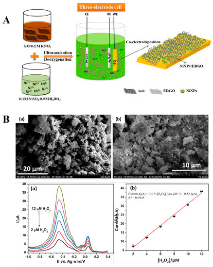 (A) The electrochemical fabrication process of NiNPs/ERGO-modified ITO electrode by using one-pot method [88]; Copyright 2020 Elsevier. (B) schematic representation of Ag-doped PANI nanocomposites-based electrochemical sensor for detecting hydrogen peroxide and dopamine [91]. Copyright 2020 Elsevier.