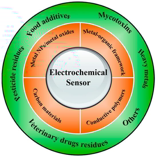 The key to electrochemical sensors for the detection of agricultural/pharmaceutical residues and heavy metal ions in food is the loading of signal factors and the development of sensing strategies. Although, based on the direct interaction between the object to be measured and the electrode modification material, the constructed non-biological sensor has the advantages of low cost, simple operation, and good stability, compared with biosensors based on enzymes, aptamers, antibodies, and other recognition molecules, there is still room for further improvement in specific detection. Therefore, in order to achieve a high sensitivity detection of actual food samples, it is necessary to develop new nanomaterials and the construction of highly sensitive sensing strategies, as well as the development of more stable and reliable sensing modes that are not affected via environmental factors.