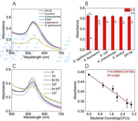 Specificity and sensitivity of the AuNPs-CF4KYP for bacteria. (A) UV-vis spectra and (B) the absorbance changes (530 nm) of the AuNPs-CF4KYP after incubating with different bacteria (E. coli, S. typhimurium, K. pneumoniae, A. baumannii, S. aureus, and DH-5α). (C) UV-vis spectra of AuNPs-CF4KYP after incubating with a different number of S. typhimurium. (D) Quantitative analysis of S. typhimurium according to the absorbance of AuNPs-CF4KYP at 530 nm. Experiments were repeated three times. Data in (B,D) are presented as mean ± S.D. Error bars were obtained from three replicate experiments. * means p < 0.05.