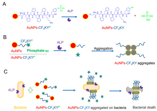 Schematic illustration of colorimetric detection and killing of bacteria by AuNPs-CF4KYP. (A) The chemical structure of AuNPs-CF4KYP and the structure of ALP cleavage products AuNPs-CF4KY. (B) The aggregation process of AuNPs-CF4KYP induced by ALP. (C) ALP cleavage products AuNPs-CF4KY aggregate in situ on the surface of the bacteria, resulting in the color change of AuNPs-CF4KYP and bacterial death.