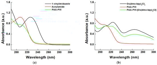 A UV-Vis spectrophotometer was employed to verify the synthesis of the mediator, as illustrated in Figure 2. UV-Vis spectroscopic results for all compounds were obtained in DI water. Figure 2a displays the outcome of the polymerization of PAA-PVI from 1-vinylimidazole and acrylamide. In imidazole, a π-π* electron transition was observed at a relatively long wavelength of 230 nm due to delocalized electrons [60]. Acrylamide displayed an absorption wavelength of 205 nm for π-π* electron transition attributable to the carbonyl and c=c double bonds [61]. The synthesized PAA-PVI compound absorbed light at a short wavelength of 215 nm, and it was determined that the absorption wavelengths of 230 nm of imidazole and 205 nm of acrylamide merged and appeared as a single peak at 215 nm, corresponding to the intermediate value [62]. Figure 2b depicts the resulting coordinates of Os(dmo-bpy)2Cl2 and PAA-PVI. Os(dmo-bpy)2Cl2 is an organometallic complex encompassing a transition metal, and the d-d transition, metal to ligand charge transfer (MLCT), and ligand to metal charge transfer (LMCT) can be observed depending on the type of ligand linked to the central metal. The synthesized PAA-PVI-Os(dmo-bpy)2Cl demonstrated an MLCT transition that was spin-allowed at 370 nm, as observed for Os(dmo-bpy)2Cl2, and confirmed that the MLCT was spin-allowed at 210 nm. Moreover, π-π* electron transitions of the ligand (LLCT) were confirmed at 225, 275 nm (Os(dmo-bpy)2Cl), and 215 nm (PAA-PVI) [63]. Hence, PAA-PVI-Os(dmo-bpy)2Cl was observed at the same wavelength as the respective absorption wavelengths of PAA-PVI and Os(dmo-bpy)2Cl2, confirming the successful synthesis of the final compound.