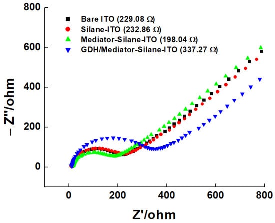 Figure 4 shows the EIS results of the electrodes. The bare ITO, Silane–ITO, Mediator–Silane–ITO, and GDH/Mediator–Silane–ITO electrodes were measured using 2 MM of K3[Fe(CN)6]/K4[Fe(CN)6] in 0.5 M of KCl, and the resistance (Rs) of the solution was 13.0 Ω. The bare ITO electrode showed a surface resistance of 229.08 Ω, and the electrode treated with surface silane showed a slight increase of 232.86 Ω in the resistance owing to the absorbance of the SAM process. When the mediator was combined with a silane-treated ITO electrode, the decrease in surface resistance due to the transition metal resulted in an EIS surface resistance of 198.04 Ω. Finally, a GDH immobilized condition (GDH/Mediator–Silane–ITO electrode) showed the resistance increasing to 337.27 Ω owing to the large molecular size of the enzyme [65]. These results show a trend similar to that of the previously identified SEM images in Figure 1, indicating that our electrodes are successfully fabricated.
