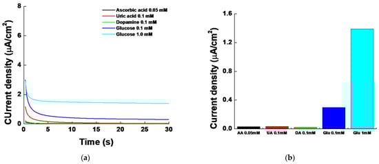 (a) I-t curve and (b) bar graph for testing the interference effect of 0.05 mM of ascorbic acid (black), 0.1 mM of uric acid (red), 0.1 mM of dopamine (green), 0.1 mM of glucose (blue), and 1.0 mM of glucose (sky blue). The bar graph indicates the current density of the I-t curves at 30 s.