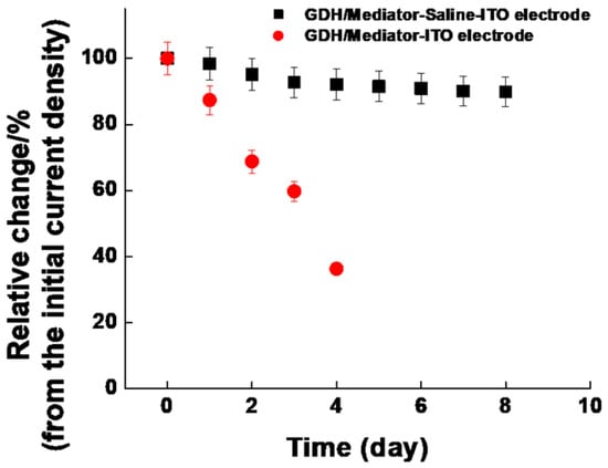 Relative change/% of GDH/Mediator–Silane–ITO (black square) and GDH/Mediator–ITO (red circle) electrodes for 8 d (GDH/Mediator–Silane–ITO electrode; %RSD = 2.73%).