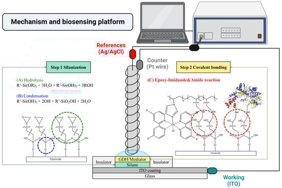 Silanization was performed as previously described to prepare the enzyme electrodes [50,51]. Scheme 1 shows the silanized chemical structure and the hydrolysis and condensation reactions on the ITO electrode. First, a 4% (v/v) solution was prepared by mixing 12 mL of GOPTS with 30 mL of toluene. ITO electrodes were cleaned with a piranha solution (H2SO4:H2O2:DW = 4:1:1) and surface hydroxy-modified, then they were placed in the GOPTS solution and allowed to react at 25 °C for 1 d.
