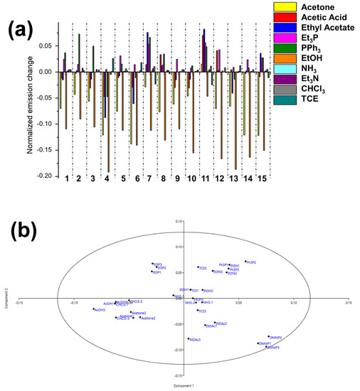 Figure 4 shows the normalized response of each probe to 100 ppm of DMMP. In particular, MBEP and PBEP show an increasing emission in the presence of the analyte, while the other probes decrease their emission. Selectivity is a crucial parameter for a real sensing device. To validate the efficacy of the array technology, we tested the response of the array to other organic molecules commonly present in the air (i.e., acetone, ethanol, acetic acid, ethyl acetate, ammonia, and triethylamine), chlorinated organic solvents (i.e., chloroform and tetrachloroethane TCE), and other phosphorous-based compounds (i.e., triethylphosphine and triphenylphosphine). In particular, Figure 5a shows the response of each probe to 100 ppm of these analytes. As we can see, each probe shows a different response to the different compound, supporting the good selectivity for DMMP, which is also confirmed by the PCA analysis reported in Figure 5b. Good clustering and discrimination can be observed with all the selected analytes. Plots also reveal that the outliers representing observations are inside the Hotelling T2 ellipses at 95% confidence.