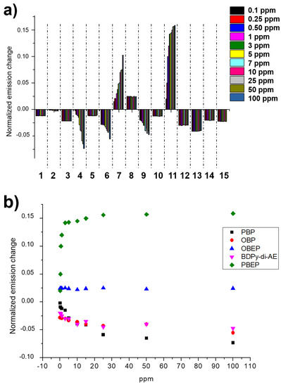 Then, we tested the array’s response to different concentrations of DMMP vapors. In particular, Figure 6 shows the change in emission of the probes at different ppm of DMMP. We note that a sort of linear response can be detected for Bodipy’s receptors, PBP, OBP, OBEP, BDPy-Di-AE, and PBEP. Furthermore, we observed that cationic Bodipy’s (MBEP and PBEP) show an increase in emission in the presence of DMMP, while non-charged probes (PBP, OBP, and BDPy-Di-AE) undergo a quenching of emission. Figure 6b shows the responses of these probes to the progressive amounts of DMMP. In particular, each probe changes its emission with different behavior, suggesting that a quantitative analysis is difficult to perform. Notably, the array can detect 0.1 ppm of DMMP, which is lower than the LD50 values of G- and V-type NAs [3].