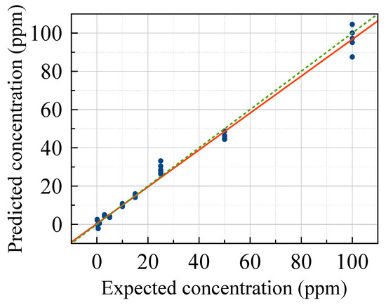 To verify the capabilities of the method in quantitative respects, we applied multivariate Partial Least Squares (PLS) regression. PLS is a multivariate statistical technique used for regression and dimensionality reduction, particularly in cases where a high-dimensional dataset is collected and it is required to establish a relationship between predictors (independent variables) and a response (dependent variable). Figure 7 reports the results. The model used 5 principal components, accounting for a cumulative Q2 value of around 0.8 as evaluated by the cross-validation procedure. Results revealed good linear multivariate regression quantification from 5 to 100 ppm. At lower concentrations, the analyte is detectable but barely quantifiable. The red line represents the linear fit, and the green line represents the ideal linear relationship. The extreme closeness and similarity of the two curves confirm a very good quantification capability above 5 ppm, close to the LD50 values of G- and V-type NAs [3].