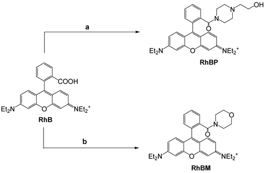 The commercially available Rhodamine-B (RhB) was treated with 2-hydroxypiperazione or morpholine in the presence of HBTU (O-(Benzotriazol-1-yl)-N,N,N′,N′-tetramethyluronium hexafluorophosphate) as coupling reagent, thus obtaining RHBP or RhBM, respectively (Scheme 1, see Supplementary Materials for the details).