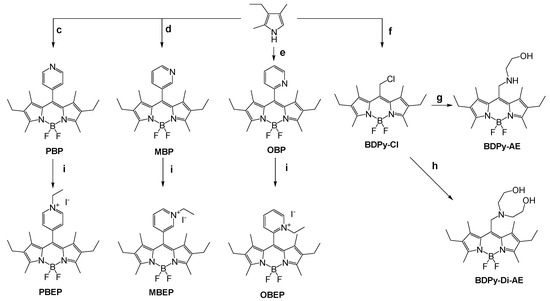 Synthetic pathways for the synthesis of Bodipy’s probes. Reagents and conditions: (c) 4-Pyridinecarboxaldehyde, TFA, DDQ, Et3N, BF3(OEt2), CH2Cl2, R.T. 24%; (d) 3-Pyridinecarboxaldehyde, TFA, DDQ, Et3N, BF3(OEt2), CH2Cl2, R.T. 17%; (e) 2-Pyridinecarboxaldehyde, TFA, DDQ, Et3N, BF3(OEt2), CH2Cl2, R.T. 24%; (f) chloroacethyl chloride, Et3N, BF3(OEt2), CH2Cl2, R.T. 22%; (g) ethanolamine, Et3N, CH3CN, 80 °C, yield 49%; (h) diethanolamine, Et3N, CH3CN, 80 °C, yield 49%; (i) Iodoethane, CH3CN, 50 °C, 95%.