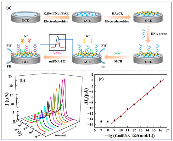Pathological studies have shown that miRNA-122 acts to repress oncogenes involved in different HCC features, and downregulation of miRNA-122 can cause tumor metastasis and hepatocellular carcinoma progression [45]. Therefore, simple and sensitive detection of miRNA-122 is highly relevant for the early diagnosis of HCC. Gao et al. [46] proposed an electrochemical biosensor based on the ion barrier effect for the detection of miRNA-122. A schematic diagram of the preparation and operation of the sensor is shown in Figure 2a. Prussian blue (PB) and gold nanoparticles (AuNPs) were first modified on the surface of a glassy carbon electrode (GCE) by a two-step electrodeposition method. The addition of Prussian blue was able to sensitize the GCE electrode to K+, resulting in a significant change in the voltammetric signal. KNO3 was chosen to provide K+. The modification of AuNPs enabled the GCE electrode to immobilize thiolated DNA probes by the self-assembly of Au-S bonds. An ionic barrier effect was produced when the DNA probe hybridized specifically with the target miRNA-122, preventing the diffusion of K+ from the solution to the electrode surface. In this way, the voltammetric signal at the electrode surface was suppressed, which achieved the quantitative detection of miRNA-122. The electrochemical response of the sensor was studied using DPV. Figure 2b and Figure 2c, respectively, show the DPV response curve and calibration curve of the sensor. The sensor has a response time of 60 min and can analyze miRNA-122 in the concentration range of 0.1 fmol/L–1.0 nmol/L with a detection limit of 0.021 fmol/L. This biosensor based on the ion barrier effect has the advantages of simple operation, low cost, sensitive response, high specificity, and high stability. In addition, the method shows better detection in real human serum samples and can be used to analyze complex biological samples. However, the detection time of this method is long, which is not conducive to the realization of point-of-care detection.