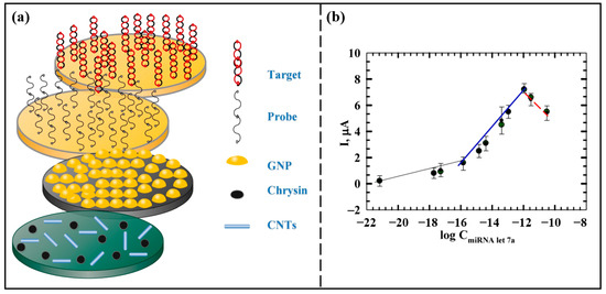 Azab et al. [50] prepared an miRNA let-7a biosensor with a sandwich structure based on nanomaterials. The schematic diagram of the biosensor is shown in Figure 4a. Chrysin and carbon nanotubes (CNTs) were, respectively, modified on the carbon paste electrode (CPE), which could improve the antioxidant property of the electrode and optimize the conductivity and biocompatibility of the electrode. Then AuNPs were employed to modify the electrode surface, enhancing both the active surface area of the electrode and the stability of the immobilized capture probe. The electrochemical response was monitored by DPV, and the optimal time for hybridization of this sensor is 30 min. Figure 4b shows the calibration curve of ∆I versus the logarithm of miRNA let-7a concentration. In this work, the current response increased with increasing miRNA let-7a concentration in the range of 1.0 zM to 11 nM, and the limit of detection was 1.0 zM. The introduction of nanomaterials such as CNTs and AuNPs has been instrumental in improving the sensitivity of the biosensor. In addition, the prepared biosensor has good applicability for miRNA let-7a detection in real serum samples. The biosensor has an excellent detection limit, which is highly favorable for early detection of clinical HCC.