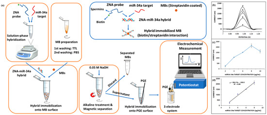 Erdem et al. [53] developed a method for electrochemical analysis of miRNA-34a based on the Zip nucleic acid (ZNA) probe. Figure 5a shows a schematic diagram of the electrochemical analysis based on the ZNA probe. ZNA probes were hybridized with target miRNA-34a in solution, and double-stranded products formed by hybridization were immobilized on the surface of magnetic beads (MBs) coated with streptavidin through biotin–streptavidin interaction. The double-stranded product was separated from the MBs by magnetic separation technique and then immobilized on the surface of pencil graphite electrodes (PGEs) for electrochemical measurements using DPV. Figure 5b–d show the DPV response curves and calibration plots of the ZNA probe hybridized with different concentrations of the target miRNA-34a. The detection limit of this method was 0.87 µg/mL in the linear range of 2–8 µg/mL. In addition, the electrochemical analysis method based on the ZNA probe is also suitable for the detection of miRNA-34a in real samples. The innovative use of ZNA probes in this sensor overcomes the electrostatic repulsion between probes and their complementary sequences, thus improving hybridization efficiency. However, the biosensor detects miRNA-34a for up to 60 min, which is not conducive to achieving point-of-care detection. In the future, with the advantage of ZNA nucleic acids combined with rapid enrichment methods such as the AC electrokinetics (ACEK) effect, the detection performance of the sensor will be improved, and the detection time will be shortened.
