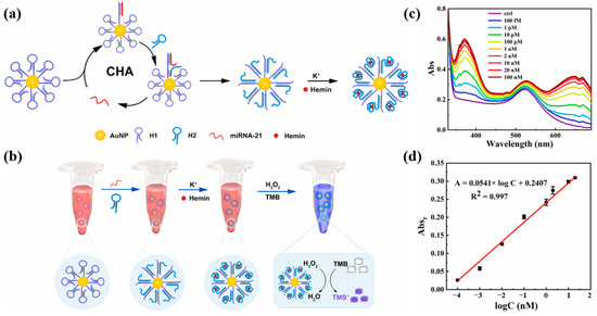 Yang et al. [71] proposed a colorimetric sensing strategy for miRNA-21 based on the combination of G-quadruplex (GQ) and CHA. The design principle of the sensor and the detection process are shown in Figure 8a,b. Multiple hairpin DNA H1 probes were attached to AuNPs. When miRNA-21 was present, hairpin DNA H1 was turned on to hybridize with miRNA-21 and hairpin DNA H2, and CHA would be triggered and continue to circulate. Upon addition of K+ and hemin, the above precursors can self-assemble into a spherical DNAzyme. DNAzyme can catalyze redox reactions and color changes. As the concentration of miRNA-21 increased, the characteristic absorption signal of oxidized tetramethylbenzidine (TMBox) gradually increased and the color of the solution changed from burgundy to blue–violet. Figure 8c shows the UV–Vis absorption spectrum for the detection of miRNA-21, and Figure 8d shows the calibration curve. The developed method has a linear detection range of 100 fM to 20 nM and a detection limit of 90.3 fM. In addition, the sensing platform has been successfully used to detect miRNA-21 in human serum, providing a promising tool for the early diagnosis of hepatocellular carcinoma. Compared with the method of Li et al. [70] for detecting miRNA-21, this method has a wider linear range and lower detection limit. However, the detection throughput of this method is low, and only one miRNA can be detected at a time.