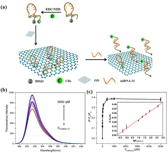 In 2023, He et al. [78] proposed another novel miRNA-21 fluorescence sensing strategy based on CDs. The schematic diagram of this biosensor for the detection of miRNA-21 is shown in Figure 10a. A molecular beacon (MB) probe (CDs-MB-BHQ1) was constructed using CDs as fluorophores and BHQ1 labeled at the 5′ end of the DNA probe as a bursting agent. Not only can graphene oxide (GO) act as a co-bursting agent but it can also adsorb the MB probe. When miRNA-21 hybridized with the loop region of the MB probe, the hairpin MB probe opened, increasing the distance between the CDs and BHQ1. The MB probe was released from the GO, restoring the fluorescence intensity of the CDs. Figure 10b and Figure 10c, respectively, show the fluorescence spectra and calibration curve of the sensor for miRNA-21 detection. The fluorescent biosensor can be used to determine miRNA-21 in the range of 0.5–800 pM with a detection limit of 500 fM. In addition, the MB probe can be used to detect miRNA-21 levels in real human serum. Although this sensing strategy is relatively novel, it requires labeling of DNA probes, which is complicated to operate. The detection limit of this strategy for miRNA-21 is not adequate for clinical applications, and efforts are needed to enhance the sensitivity of the fluorescent sensor.