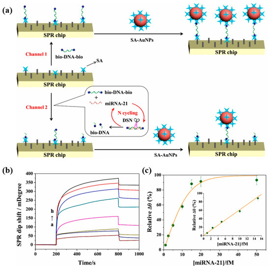 In conventional surface plasmon resonance biosensors, the hybridization and enzymatic digestion reactions to detect biomarkers are performed on the chip surface. Huang et al. [81] proposed an innovative method to perform hybridization enzymatic digestion cyclic reactions in solution for miRNA-21 detection. The schematic diagram of this SPR biosensor is shown in Figure 12a. The target-free probe solution (bio-DNA-bio/DSN) was injected into the reference channel, the target-containing probe solution (bio-DNA-bio/miRNA-21/DSN) was injected into the detection channel, and SA-modified gold nanoparticles (SA-AuNPs) were injected into both channels. In the channel without miRNA-21, bio-DNA-bio adhered to the SA-modified chip via SA-bio binding and captured the SA-AuNPs, obtaining a stronger SPR signal. However, in the channel containing miRNA-21, the DNA hybridized with miRNA-21 was digested by DSN, and miRNA-21 was released into the next enzymatic cycle while many bio-DNA fragments were generated. The generated bio-DNA and undigested bio-DNA simultaneously bound to the SA on the surface of the chip, and the captured SA-AuNPs were reduced, leading to a decrease in the SPR signal. In Figure 12b, the SPR signal decreases with the increase in miRNA-21 concentration. Figure 12c demonstrates that the biosensor has a good linear correlation in the range of 1–15 fM. The SPR signal can be detected even when the concentration of miRNA-21 is as low as 1 fM. The sensing strategy of the SPR biosensor proposed in this study is relatively novel, and the SPR signal amplification can be realized by releasing miRNA-21 to participate in the cycle only through the DSN-digested DNA probes. Although the detection limit of this biosensor is ideal, its linear range is narrow compared to other studies of the same type, and the detection results are easily affected by errors.