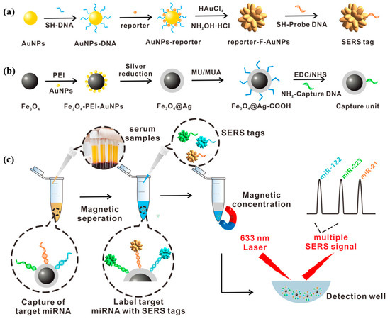 (a) Schematic diagram of the synthesis process of SERS tag. (b) Design and synthesis of capture substrate. (c) Multiple miRNA detection methods based on the capture substrate/miRNA/SERS tag sandwich structure. (Reproduced with permission from [88]).