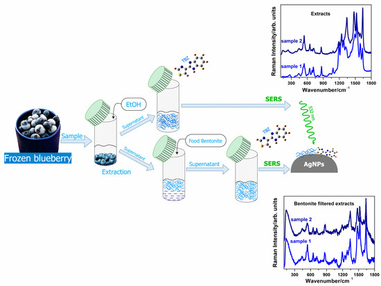 The sensitivity of the proposed method allows for the efficient monitoring of TBZ in solutions resulting from frozen fruit extracts reaching the detection limits (LOD) of this approach at 10−7 M. The blueberry fruit extracts control for TBZ via SERS, resulting in a multiplexing assay; this is due to the strong SERS signal of anthocyanins, which is characteristic of these fruit products. Here, we employed bentonite to adsorb a substantial amount of molecular extracts and lower the SERS background for improved SERS detection of TBZ in frozen fruits.
