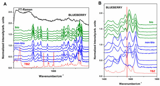 (A) Typical SERS spectra of 11 different crude blueberry extracts—from different market stocks. The “bio” and “non-bio” stocks are indicated with different colors. The SERS spectrum of TBZ alone is given in bottom as a dotted line for the eye guide. The FT-Raman spectrum of blueberry is given with black color on the top. (B) Spectral detail in the 1400–1700 cm−1 range is given in the right panel to highlight that the main TBZ band is not overlapped by the crude extracts’ bands.