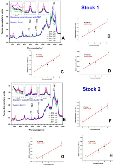 The measurements were conducted for two independent and randomly selected blueberry stocks, denoted stock 1 and stock 2 in Figure 4. SERS measurements were run in similar conditions, and the SERS protocol was similar. The volume ratio of extract to TBZ solutions used revealed that increasing the amount of sample (extract + TBZ) results in increasing the SERS background, along with the increased TBZ characteristic SERS bands (Figure 4A, E). Even so, data analysis revealed that the three main bands of TBZ at 1571, 1005, and 778 cm−1 were detectable in the multiplexed SERS feature among the flavonoid bands, and their intensity increased with the increasing TBZ concentration. The linear fit of intensity plot of the three main bands of TBZ at 1571, 1005, and 778 cm−1 as a function of concentration showed a coefficient R2 of 0.81, 0.94 and 0.93 (Figure 4B–D) for stock 1 and 0.98, 0.89, and 0.91 (Figure 4F–H) for stock 2, respectively, as comparatively shown in Figure 4 for the two independent stocks. Thus, using any of the three main bands of TBZ, the limit of detection was submicromolar in each case, as indicated in Figure 4.