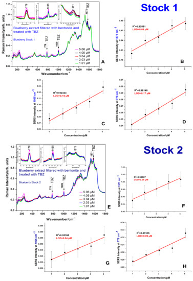SERS spectra of bentonite-filtered blueberry extracts (upper, (A): stock 1, lower, (E)- stock 2, as indicated) treated with TBZ at concentrations from 1.01 to 5.06 µM as showed with color code. The insert showed spectral details of the three main bands of TBZ, at 1571, 1005, and 778 cm−1, respectively, and the plot of SERS intensity of these bands of TBZ as a function of concentration is shown individually, (B–D) for stock 1, (F–H) for stock 2. A linear fit with a slightly different R2 coefficient of determination and the LOD is given in each plot. Error bars represent the relative error of each determination (percentage). Excitation: 532 nm. Note the lower LOD compared to those from Figure 4 (non-filtered on bentonite).