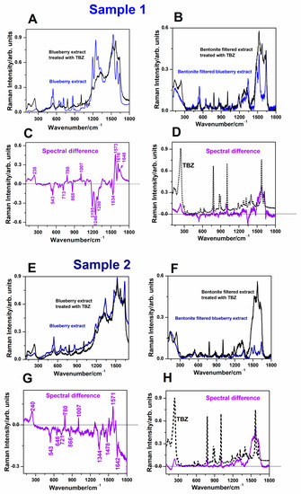 (A). SERS spectra of two stocks of blueberry extracts, denoted sample 1 and sample 2, in comparison with TBZ-treated ones (B) SERS spectra of bentonite-filtered blueberry fruit extract in comparison with TBZ-treated ones and the calculated spectral difference (between treated and normal) are plotted in (C), respectively; (D,E). Raw SERS spectra of blueberry fruit extract from independent market fruit stock (sample 2) in comparison with the TBZ-treated one; (F) SERS spectra of bentonite-filtered blueberry fruit extract compared to the TBZ-treated one; and the calculated spectral differences (between TBZ-treated and normal) from (E,F) are plotted in (G,H), respectively. Note the improved and unambiguous detection of the TBZ bands in the bentonite-filtered extract from (H). SERS of TBZ is showed in the dotted spectrum from (H).
