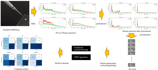 As a data mining and modeling tool, machine learning (ML) significantly simplifies Raman data processing and is suitable for spectral data analysis [43,44]. Chen et al. made a distinction between ovarian cancer, cysts, and normal patients based on machine learning algorithms [45]. W. Gao and coworkers carried out the fast and accurate prediction of lignin content by using a random forest algorithm. Seongyong Park and coworkers used the RBFSVM classifier to detect Pb2+ in water [1]. Xu et al. reviewed the basic principle and strategy of Pb2+ detection based on SERS, which provided a good theoretical basis for the combination of machine learning and SERS to detect Pb2+ [41]. These examples illustrate the successful implementation of machine learning techniques on spectroscopy data sets.