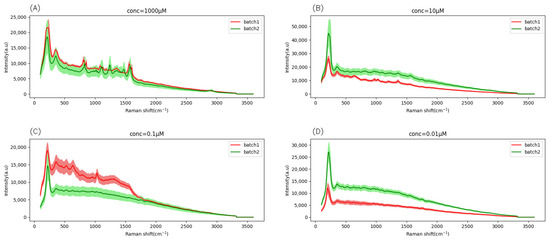 The raw Raman spectrum. The shaded part refers to the standard deviation of the spectrum. (A) conc = 1000 µM, (B) conc = 10 µM, (C) conc = 0.1 µM, (D) conc = 0.01 µM.