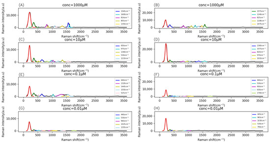 The fingerprint range analysis results for (A,B) conc = 1000 µM, (C,D) conc = 10 µM, (E,F) conc = 0.1 µM, and (G,H) conc = 0.01 µM. Left: batch 1; right: batch 2. The red line represents the vibration peak at 215 cm−1 and the dark green line represents the vibration peak at 360 cm−1.