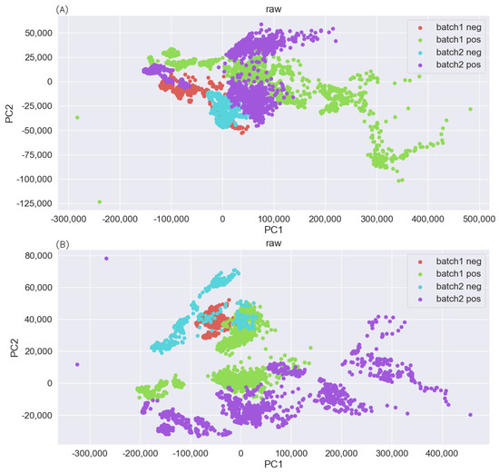 In practice, errors caused by manual operation cannot be excluded, and it has been proven that there are obvious differences in Raman spectra, so it is necessary to analyze data sets. PCA can achieve feature dimension reduction by calculating feature vectors in its feature covariance matrix. The eigenvector corresponding to the principal component is used to reconstruct the new data, which has the greatest variance in the direction of the eigenvector. A single batch of data sets was used to learn PCA, which was then used to process another batch of secondary data sets, retaining 95% of the variance. We projected the principal components of two batches of data onto a public space; these are shown in Figure 4. The positive and negative samples of these two batches were aggregated separately and could not be linearly separated in their respective classes. This indicates that the batch effect existed in the data set, causing some domain generalization problems and seriously affecting the classifier’s performance in processing unseen data.