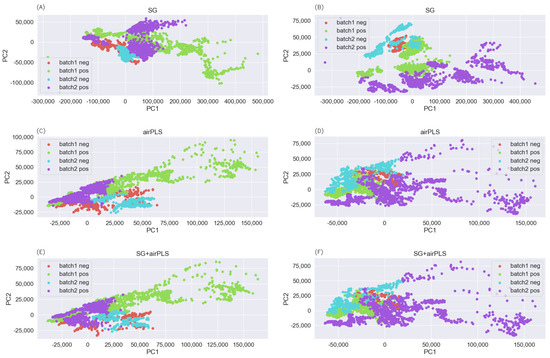 In order to reduce the adverse effects caused by the batch effect, the corresponding effects of different pretreatment techniques were studied, including the SG filter, the airPLS algorithm, standard normal distribution normalization, area normalization, and so on. Figure 5 and Figure 6 show the PCA visualization results after pretreatment using different combinations of methods. As can be seen from Figure 5, the SG filtering algorithm had a large gap and poor effect compared with the airPLS algorithm. As in previous studies, using the airPLS algorithm to remove the baseline reduced the adverse effects of the batch effect and improved linear separability. However, when combined with the normalization method, the SG filtering algorithm performed well in this aspect, had good alignment, and improved the linear separability of the data. The GBDT algorithm performed better than the others in the above method and the best in the SG+area+SNV method.