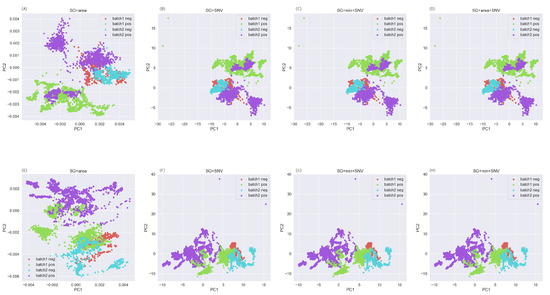 Visualization of the PCs of the SG spectrum for (A,E) area normalization, (B,F) SNV normalization, (C,G) maximum and minimum value normalization + SNV normalization, and (D,H) area normalization + SNV normalization. Top: batch 1. Bottom: batch 2.