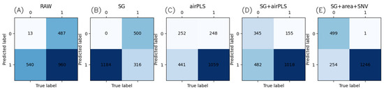 Confusion matrix of the GBDT model test results for (A) raw, (B) Savitzky–Golay, (C) airPLS, (D) Savitzky–Golay+airPLS and (E) Savitzky–Golay+area+SNV. The color deepens as the number of classified samples increases.