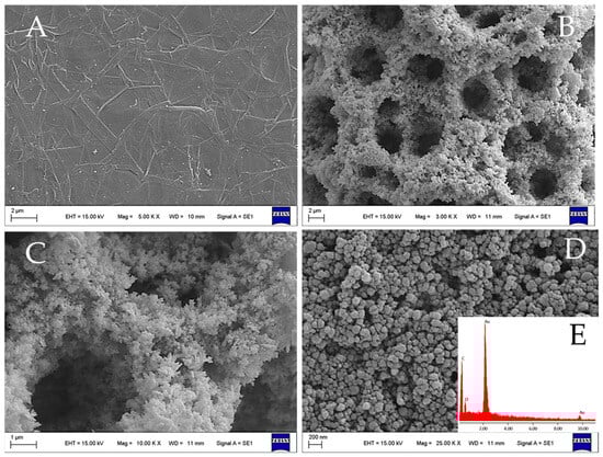 The CNH/GNP nanocomposite was synthesized via DHBT electrodeposition on the GPE working electrode. The DHBT electrodeposition method relies on generating hydrogen bubbles at the electrode surface by applying a negative potential in an acid medium. These hydrogen bubbles effectively hinder the migration of gold ions to nucleation sites on the electrode, leading to the spontaneous formation of random micropores during the metal deposition process. This resulting honeycomb-like dendritic structure significantly enhances the surface roughness, thereby providing an enlarged surface area [27]. The GPE/CNH/GNP were subjected to morphological characterization through SEM imaging at various magnification levels. Figure 2A exhibits the unaltered morphology of the graphite carbon surface prior to any modification procedure. Figure 2B,C provide a detailed view of the distinctive, uniformly distributed gold nanoporous honeycomb-like structures that emerge following the graphite modification. The nanocomposite surface exhibits structural anomalies resulting from the intertwining network of CNH with dendritic gold formations. Also, Figure 2D illustrates the presence of CNH, acting as the scaffolding for generating the dendritic gold honeycomb structures. An EDS spectrum was examined to investigate the elemental composition of the nanoarchitecture. As depicted in Figure 2E (inset), the spectrum exhibits distinct peaks corresponding to carbon (C) at an energy of 0.24 KeV and gold (Au) at energies of 2.35 and 9.91 KeV. In the semi-quantitative microanalysis, it was determined that the concentration of gold (Au) accounted for 90%, while carbon (C) constituted 10% of the elemental composition. The crystalline structure of the GPE/CNH/GNP was characterized by XRD measurement. The peaks at 2θ (23.1 and 26.5°) were from graphite and CNH, respectively, and the peaks at 2θ (42.6, 54.3 and 68.9°) resulted from the GNP. The XRD pattern is shown in Supporting Information (Figure S1).