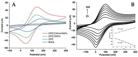 (A) CVs of blank in the GPE/CNH/GNP (black line), GPE (blue line), GPE/GNP (green line), and GPE/CNH/GNP (red line) recorded in 1 mmol L−1 [Fe(CN)6]−3 in 0.1 mol L−1 KCl at a 75 mV s−1 scan rate. (B) CVs recorded with the GPE/CNH/GNP in [Fe(CN)6]−3 in 0.1 mol L−1 KCl at 25, 50, 75, 100, 125, 150, and 200 mV s−1. Inset: Dependence of the redox peak current values on the square root of the scan rate (ν1/2).